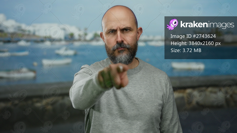 Man with beard pointing outdoors near seaside with boats visible in the background and wearing casual grey shirt under clear sky showing stern expression. - Kraken Images