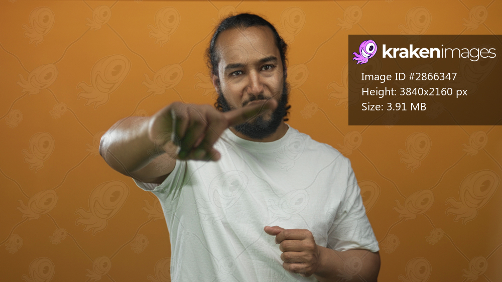 Man with beard points finger at camera in studio with orange backdrop and white t shirt; confidence assertion.