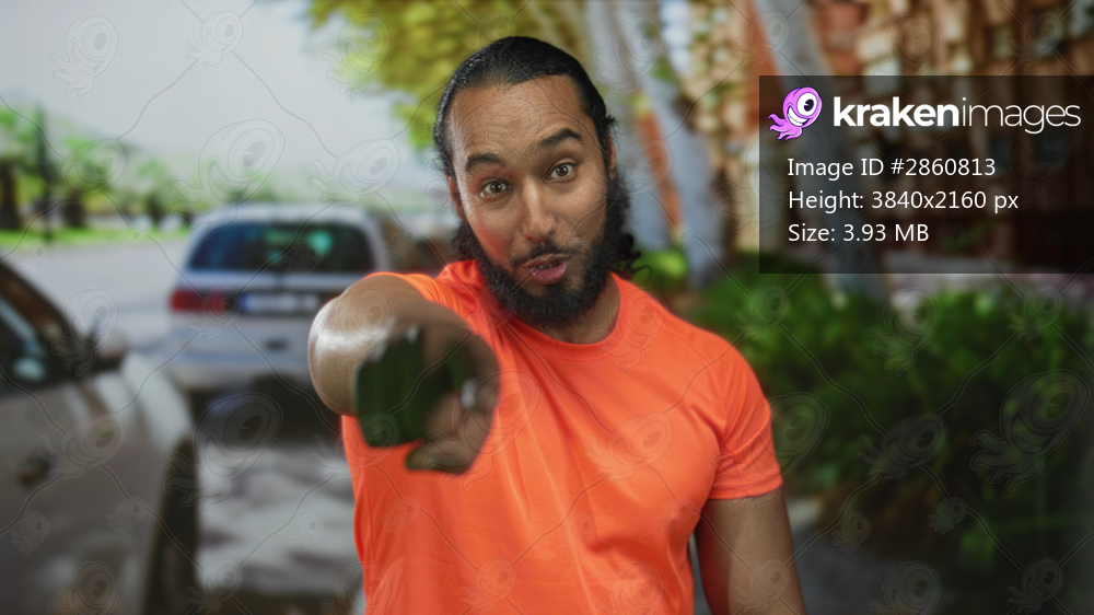 Man with beard points finger at camera on city street near parked cars wearing bright orange shirt; confidence challenge.