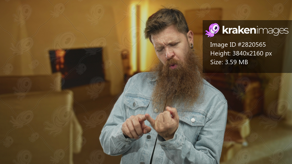 Man with beard points finger to finger in living room of a building with sofa and fireplace; curiosity introspection.