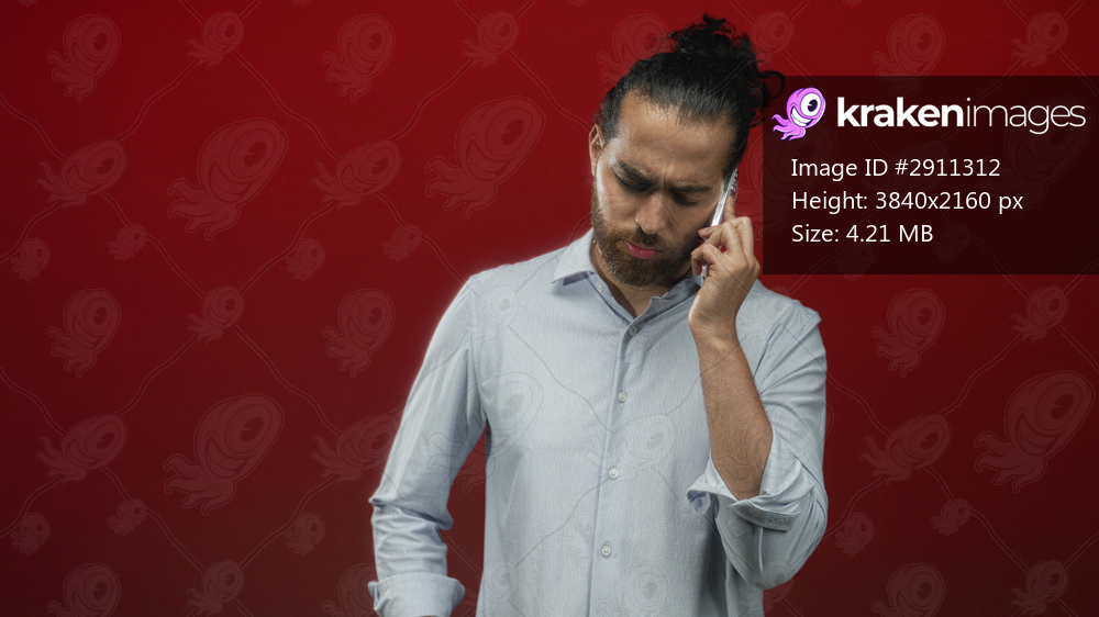 Man with beard and rolled sleeves holding smartphone to ear in red studio wearing light blue shirt; concern decision reflection.