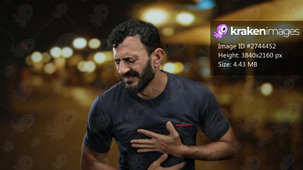 Man with beard showing expression of discomfort on a dimly lit street with bokeh lights outdoors at night.