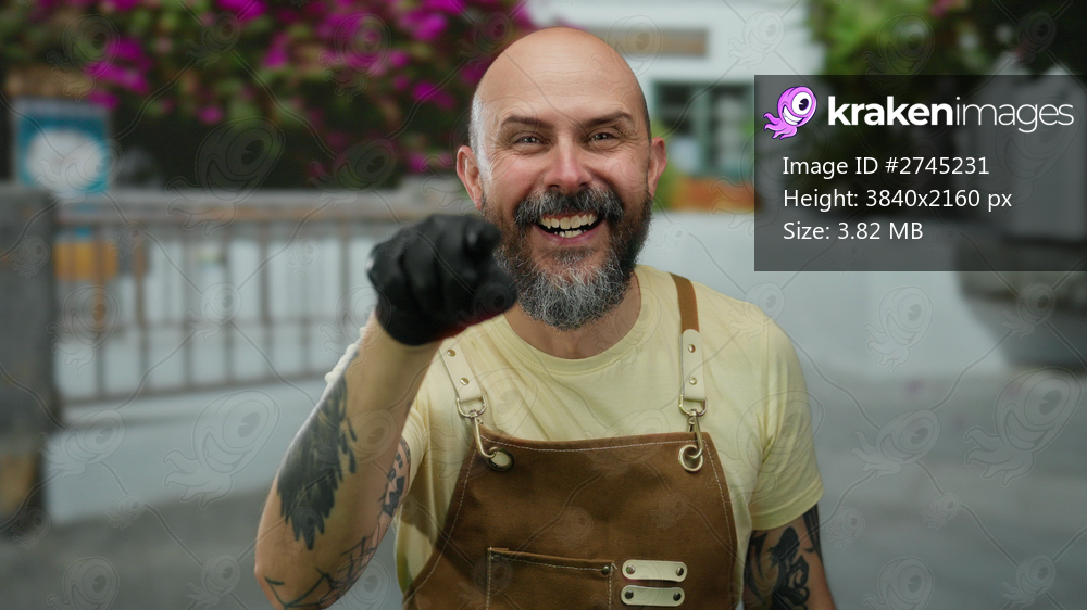 Man with beard smiling broadly outdoors pointing in urban environment wearing apron tattoos in focus vibrant floral background adding color and energy to the scene - Kraken Images