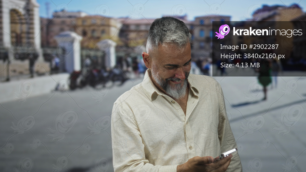 Man with beard smiling and holding smartphone while looking down on a busy city street; contentment connection.