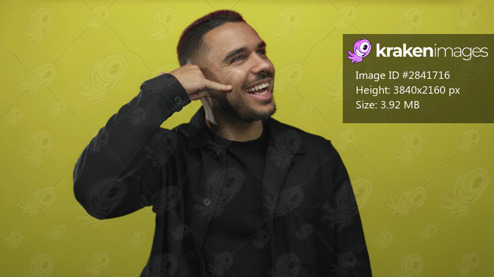 Man with beard smiling holds hand shaped like a phone to ear in bright yellow studio setting; playfulness.