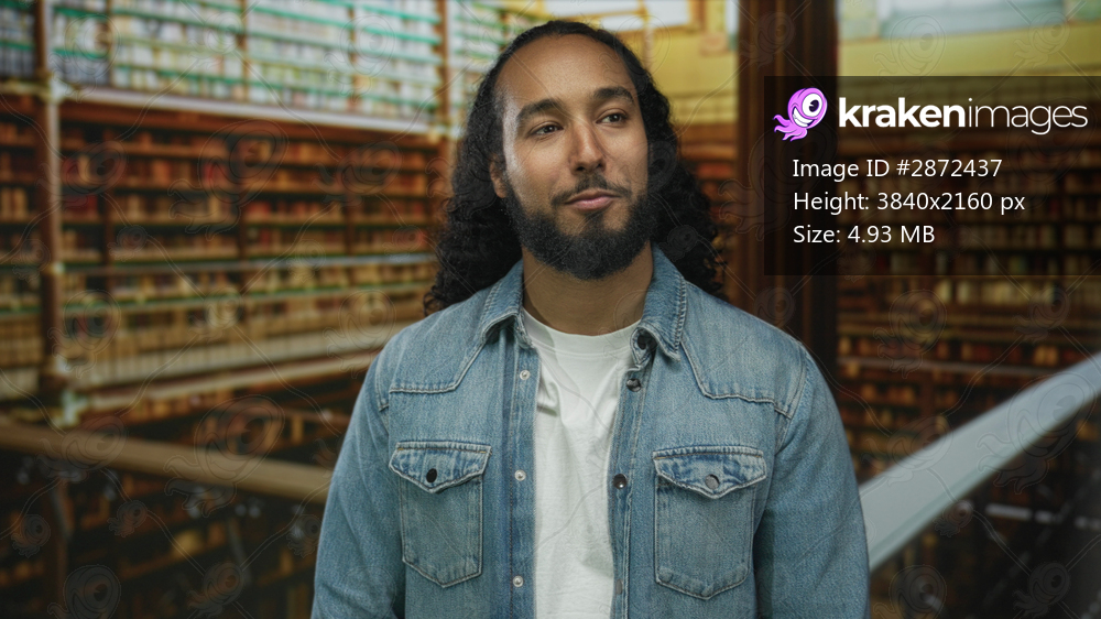 Man with beard smiling and looking sideways in a library building among bookshelves and railing; thoughtful curiosity.