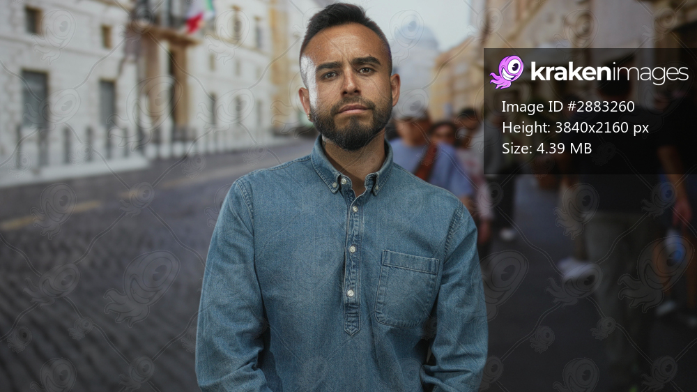 Man with beard standing and facing camera on a busy city street in denim shirt with blurred pedestrians and scooter nearby; determination.