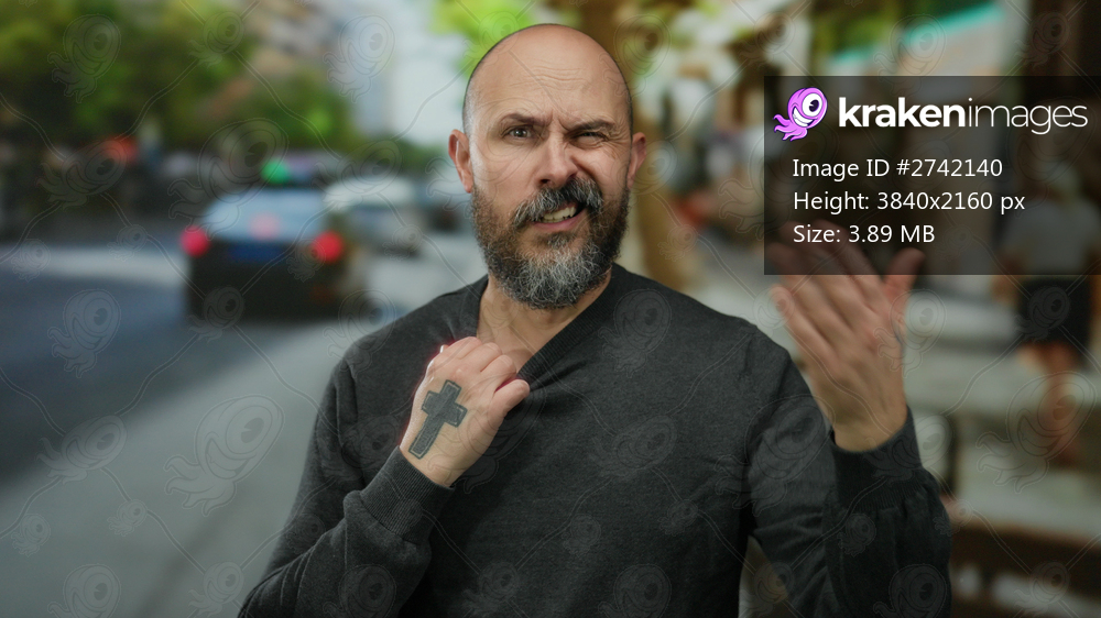 Man with beard standing on urban street outdoors appearing hot and uncomfortable in the summer heat.