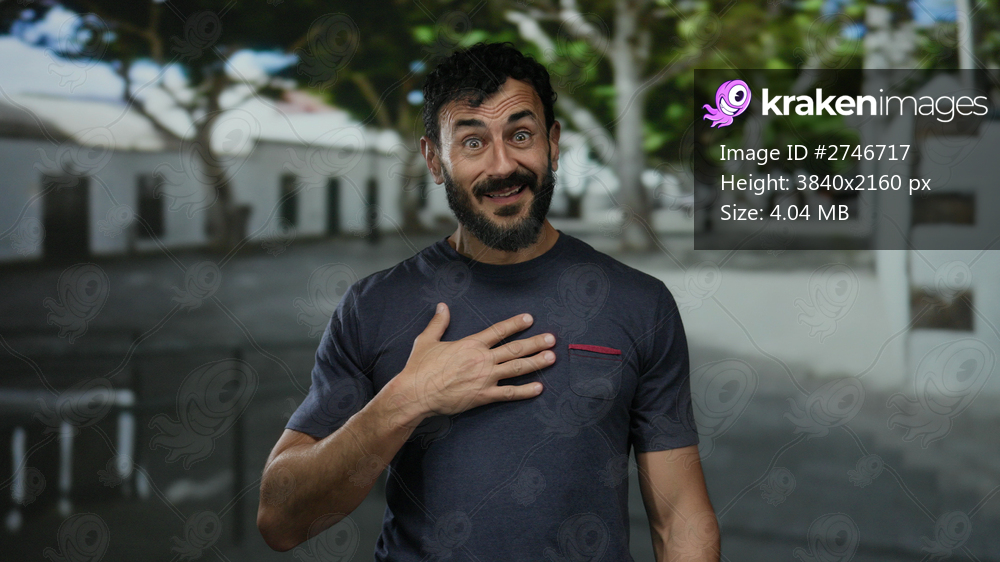 Man with beard standing outdoors on a sunny street background expressing surprise with hand on chest
