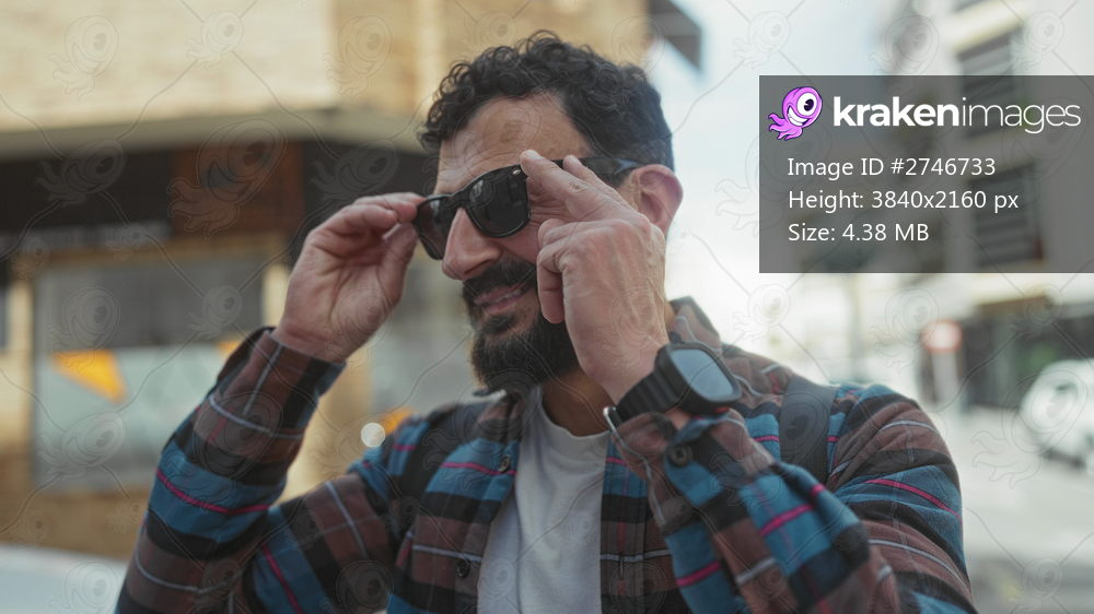 Man with beard and sunglasses standing outdoors on a sunny street wearing a plaid shirt and watch, exuding casual confidence in an urban setting.