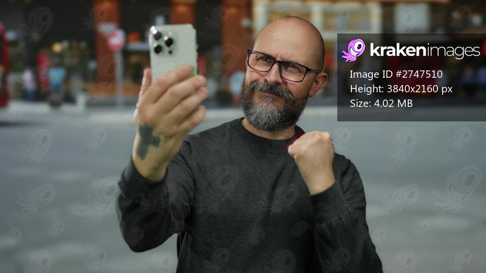 Man with beard taking selfie outdoors on urban street with bus in background, looking confident and casual in city environment, holding smartphone with glasses and tattoo visible - Kraken Images