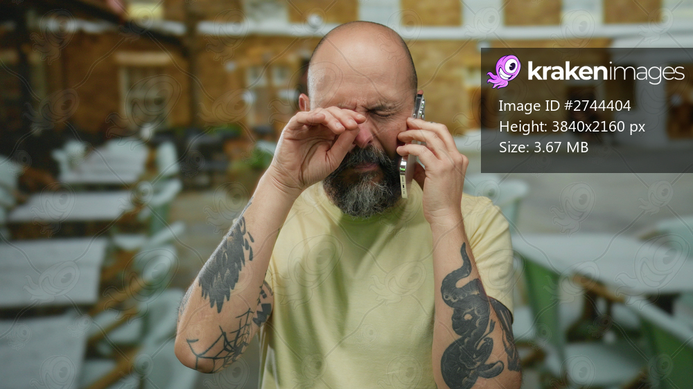Man with beard talking urgently on phone at outdoor cafe with tattoos, wearing casual shirt, expressing concern in urban city setting with blurred cityscape in background. - Kraken Images