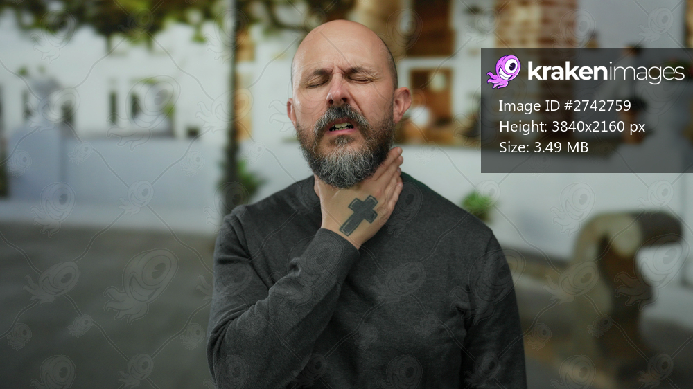 Man with beard and tattoo appears in pain on an urban street holding his throat, suggesting a sore throat symptom in a lively city environment.