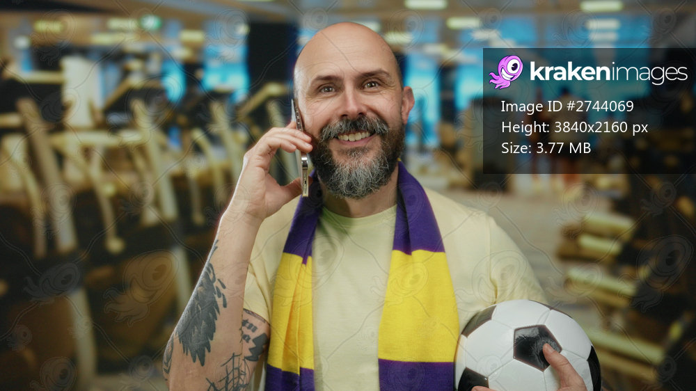Man with beard and tattoo holding soccer ball talking on phone in gym, wearing scarf, captured creating an energized yet relaxed feel amidst modern gym equipment in bright lighting. - Kraken Images