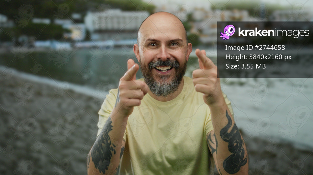 Man with beard and tattoos playfully gazing through hand binoculars at seaside, wearing casual yellow shirt on sandy beach smiling outdoors with blurred sea background - Kraken Images