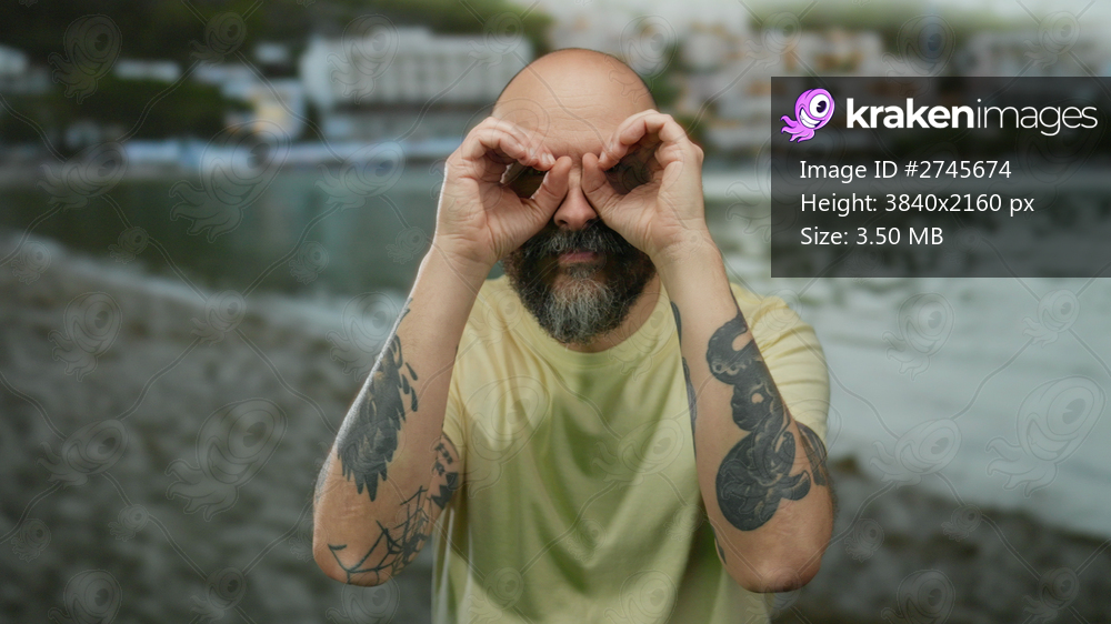 Man with beard and tattoos playfully gazing through hand binoculars at seaside, wearing casual yellow shirt on sandy beach smiling outdoors with blurred sea background - Kraken Images