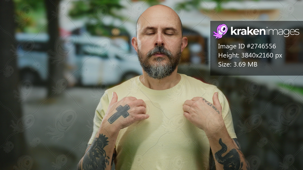 Man with beard and tattoos stands outdoors in urban setting, expressing emotions with gestures on street background.
