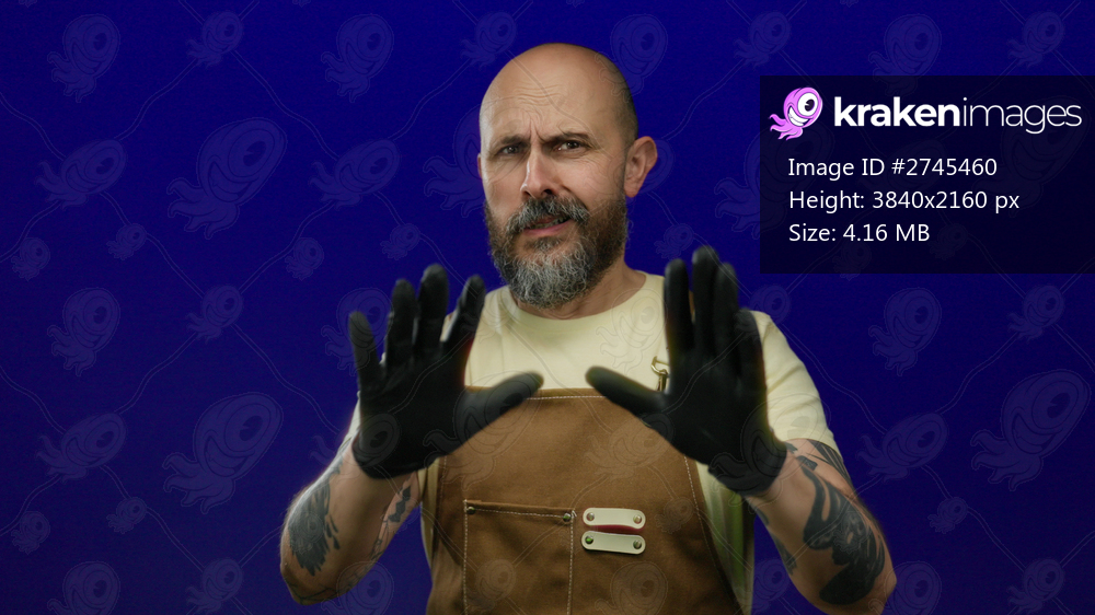 Man with beard and tattoos wearing gloves and overalls looks concerned against an isolated blue background