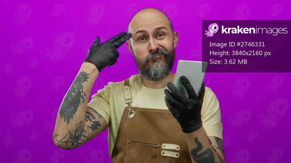 Man with beard and tattoos wearing gloves reads notepad against vibrant purple background looking curious and thoughtful.