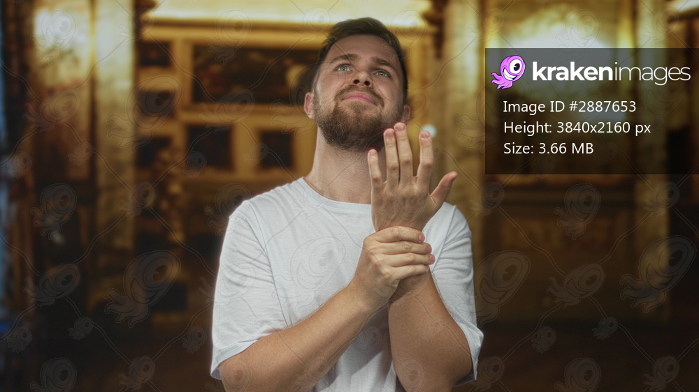 Man with beard touching chin and holding wrist while looking upward inside ornate church building in soft warm light; faith contemplation.