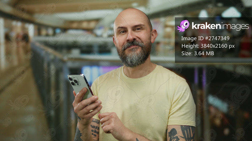 Man with beard uses smartphone inside a modern shopping mall, showcasing urban lifestyle in a bustling indoor setting with ample lighting.