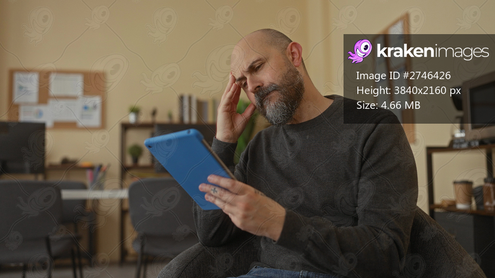 Man with beard using tablet in modern office interior, looking thoughtful, wearing casual sweater, surrounded by office furniture and decorations, conveying work and contemplation. - Kraken Images