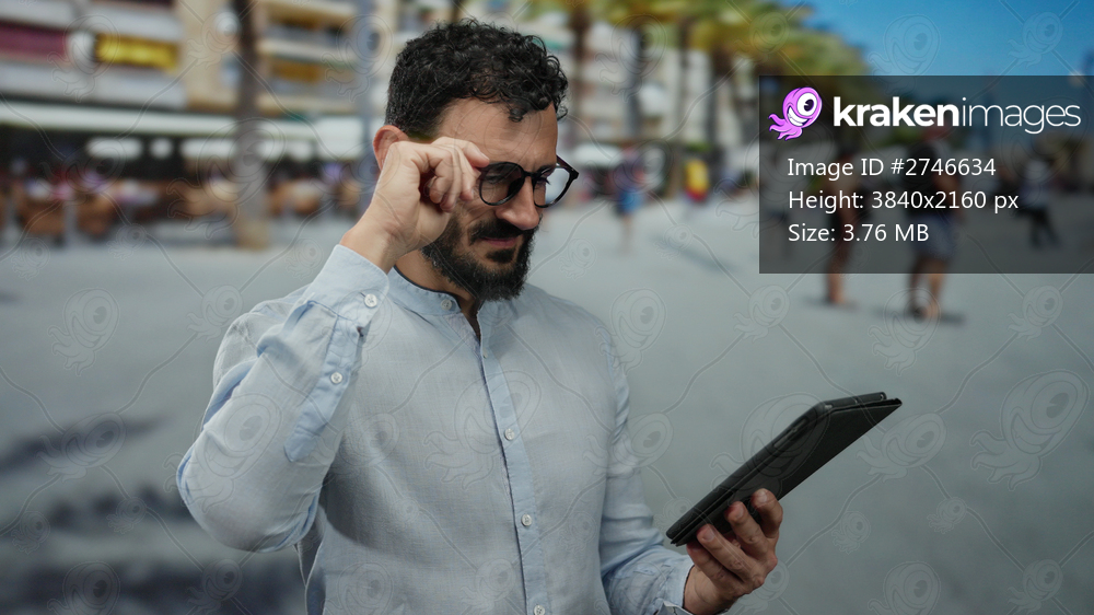 Man with beard using tablet outdoors on sunny street, adjusting glasses, showcasing hispanic ethnicity and business casual attire in lively urban environment. - Kraken Images