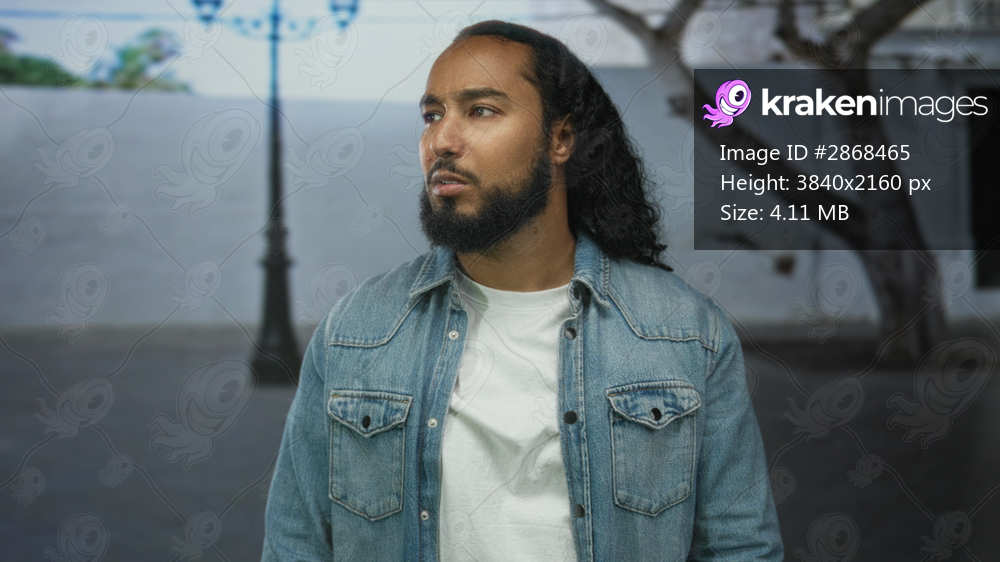 Man with beard and visible face looking to the side on a street wearing a denim jacket and white t shirt under a lamppost by a tree; quiet contemplation solitude. - Kraken Images
