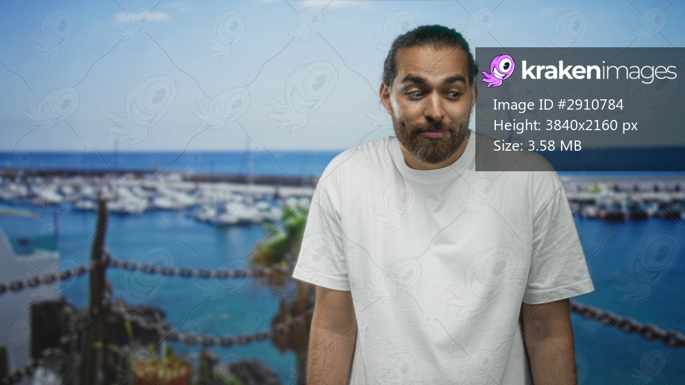 Man with beard and visible face shrugs shoulders and half smile wearing white t shirt at a port marina by the seaside docks; bemused.