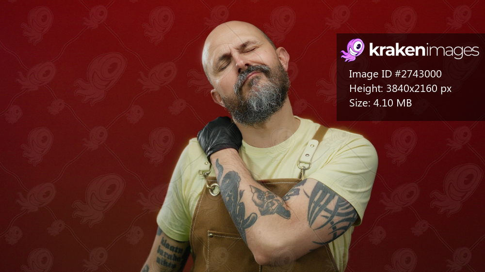 Man with beard wearing apron over red background touching his neck appearing in pain isolated in studio setting.