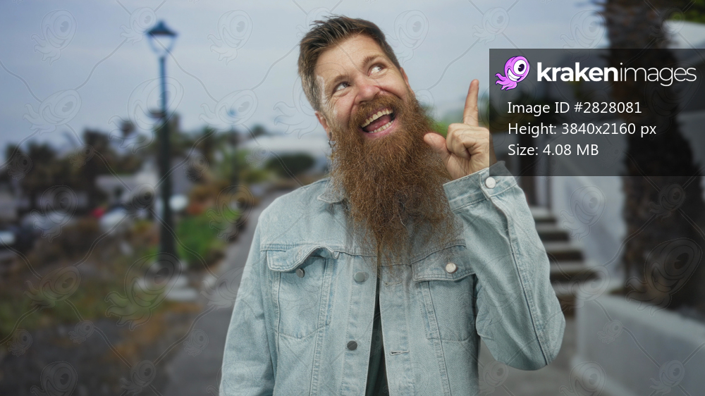 Man with beard wearing denim jacket pointing finger upward on street walkway lined with palm trees and steps; excitement.