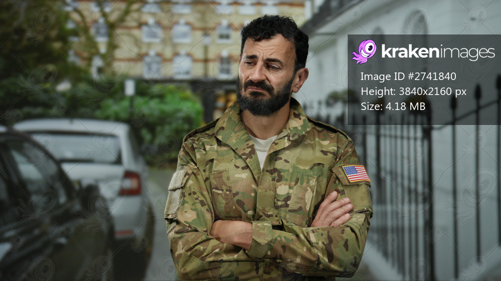 Man with beard wearing military uniform stands outdoors in city street with cars, showcasing a serious expression.