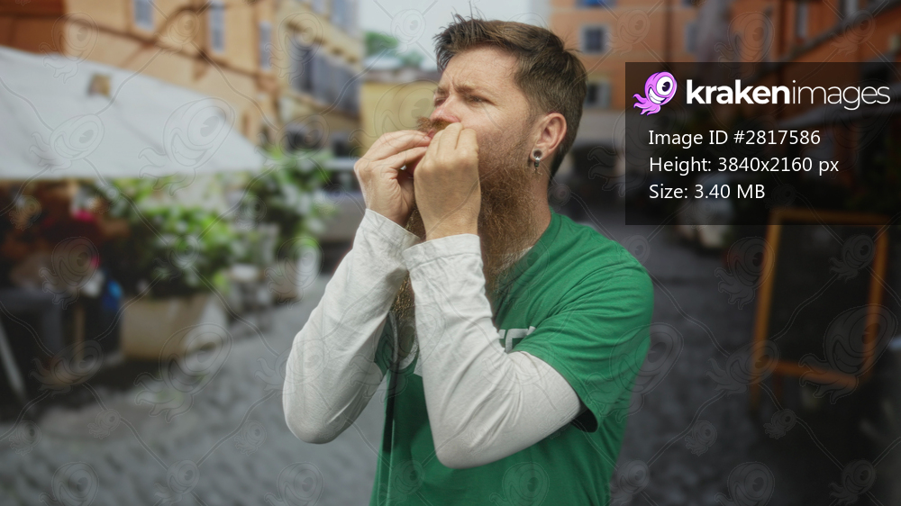 Man with beard wearing volunteer shirt blows kiss gesture toward camera on cobblestone street; affection greeting.