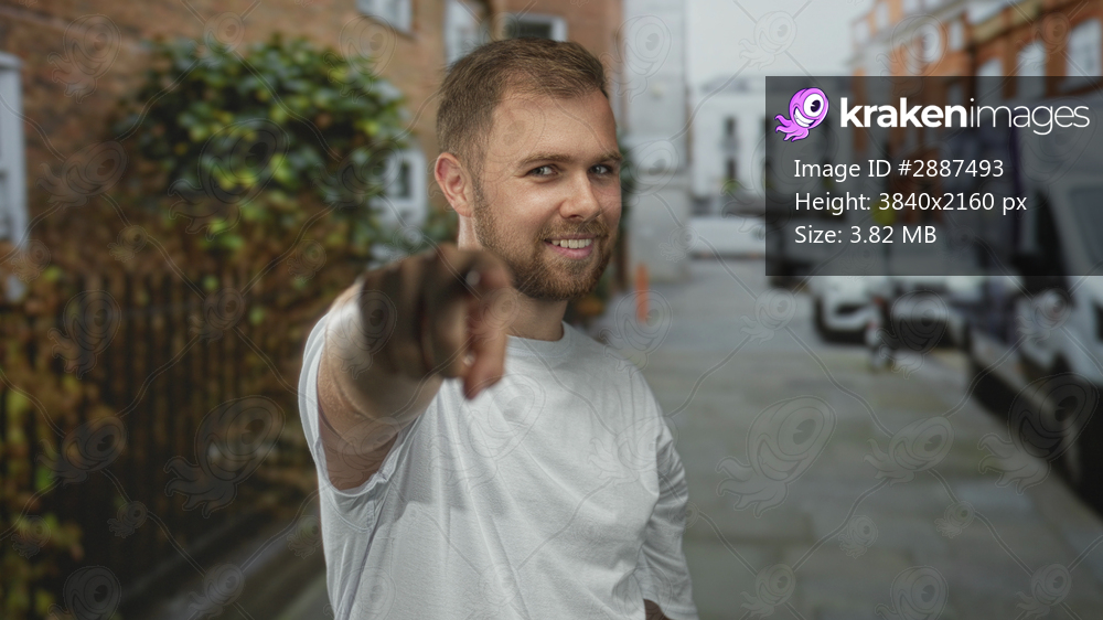 Man with beard wearing white t shirt points finger to camera on cobbled street near parked vans and iron fence; confidence friendly invitation.