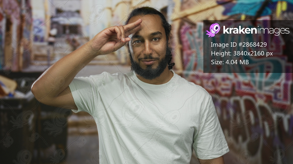 Man with beard wearing white t shirt raising hand in salute on graffiti covered city street with stairs; urban confidence connection.