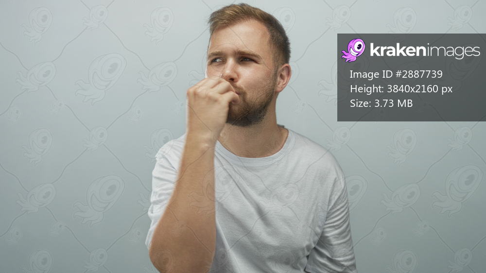 Man with beard wearing white tshirt and raised hand showing palm in light gray studio; curiosity questioning introspection.