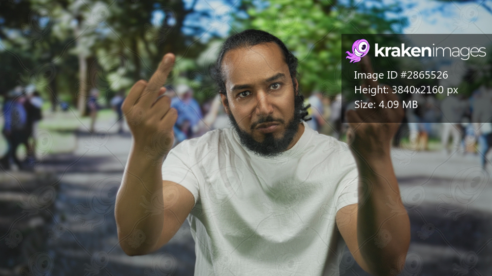 Man with beard and white t shirt showing both middle fingers toward camera in park amid a blurred crowd; anger defiance protest.