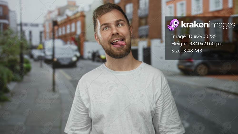 Man with beard and white t shirt sticks tongue out and tilts head, smiling broadly with visible face and neck, standing on a city street with parked cars and brick buildings; playful youth mischief. - Kraken Images