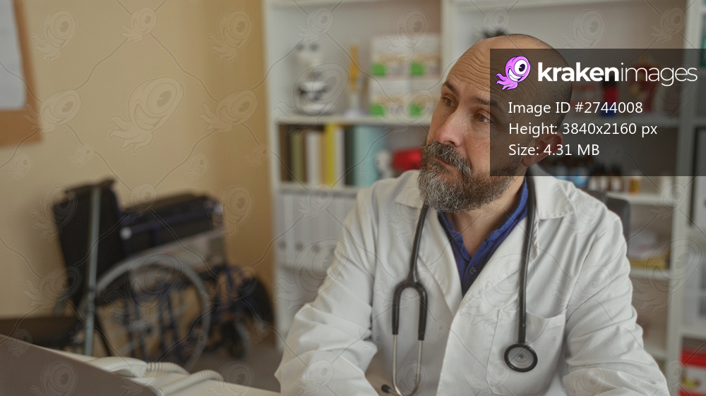 Man with beard working in hospital office, wearing stethoscope and lab coat, surrounded by medical equipment, focused on documentation in modern clinical setting. - Kraken Images