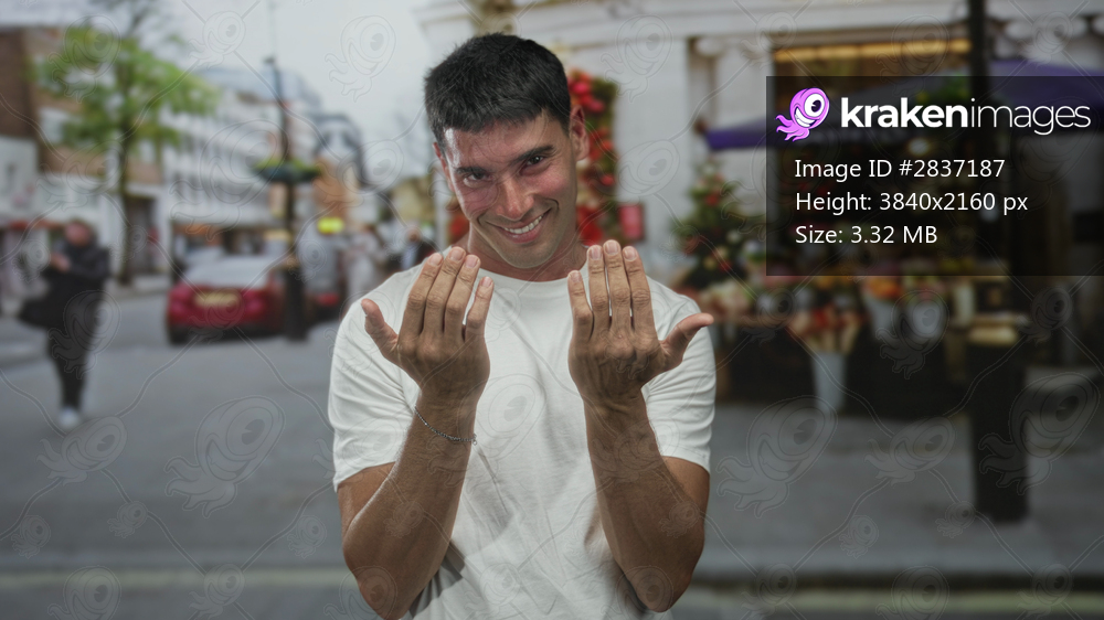 Man beckoning with both hands and smiling while standing on bustling street market outdoors; invitation.