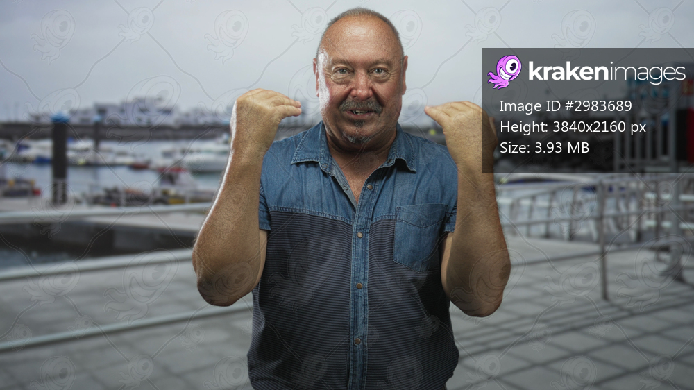 Man beckons with both hands showing palms on a harbor street near boats and pier wearing denim shirt; welcome gesture friendly.