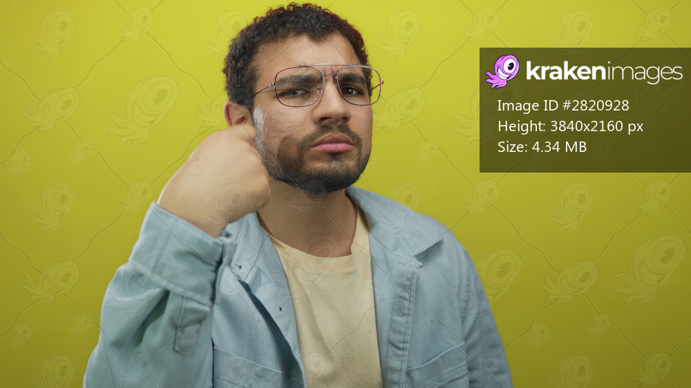 Man beckons hand in yellow studio with serious gaze and visible gesture near face wearing casual shirt; curiosity.