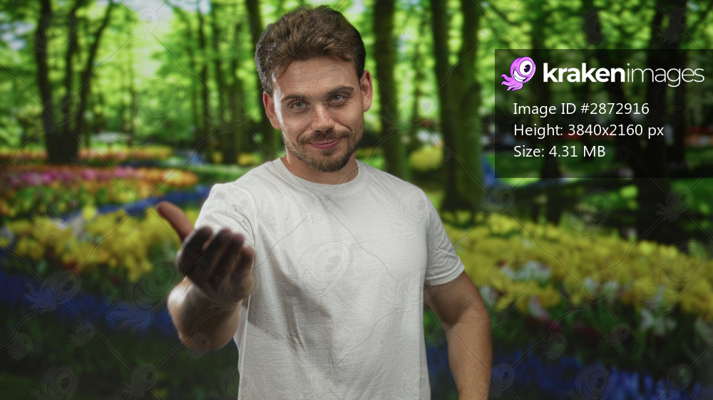 Man beckons with outstretched hand in green park, smiling broadly in front of flower beds and trees; welcome joy.