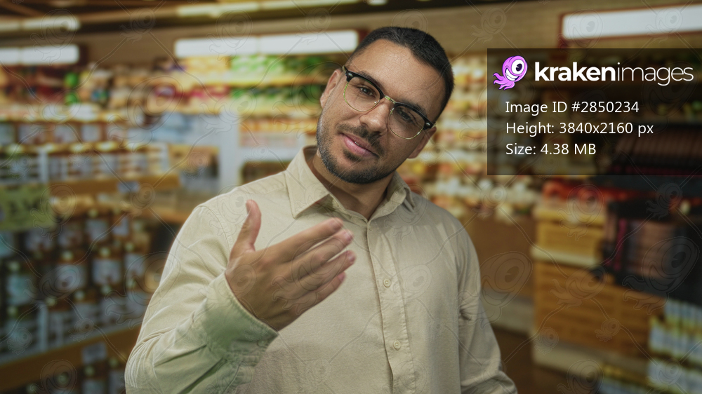 Man beckons with palm forward in a colorful supermarket building aisle filled with shelves; friendly invitation.