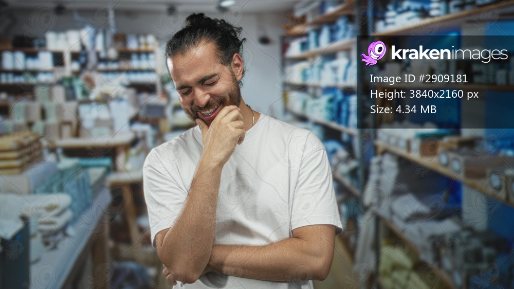 Man bites fingernail with hand to mouth inside home decor shop interior, smiling and slightly shy stance; playful mischief.