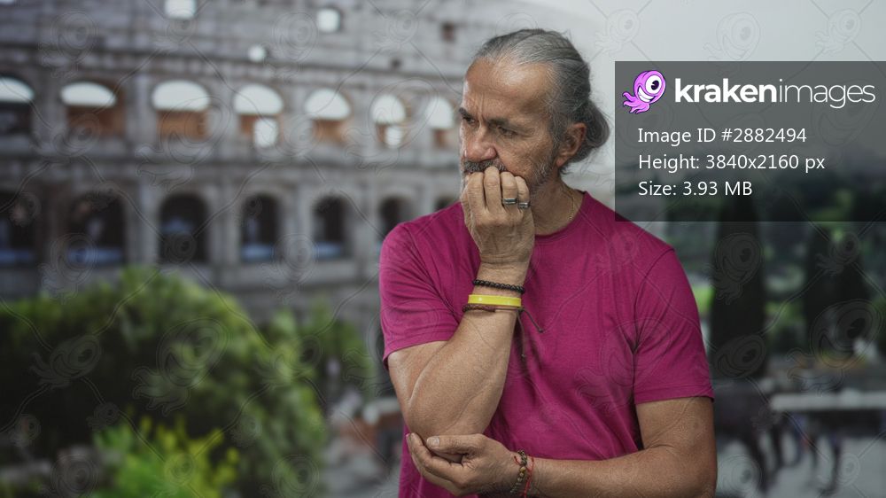 Man biting nails with hand to mouth at the roman coliseum building outdoors, long hair and bracelets visible; anxiety contemplation.