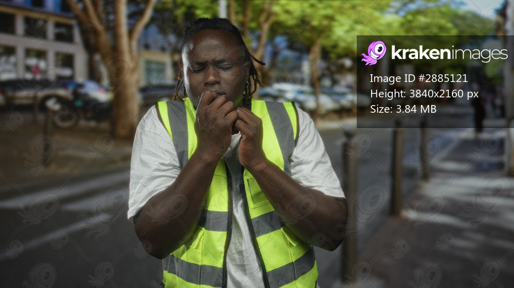 Man biting nails with hand to mouth on street wearing yellow high visibility vest; anxiety urban commute.