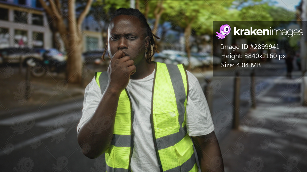 Man biting nails with hand to mouth on street wearing yellow high visibility vest; anxiety urban commute.