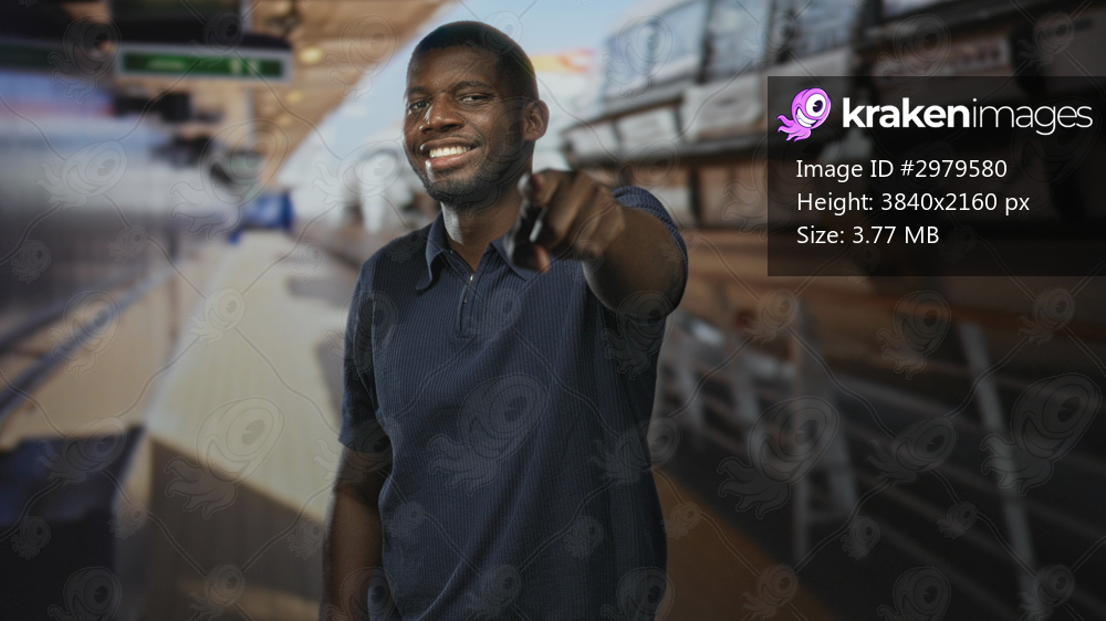 Man black smiling points finger at camera in airport terminal, hand extended toward lens with casual polo shirt; confidence.