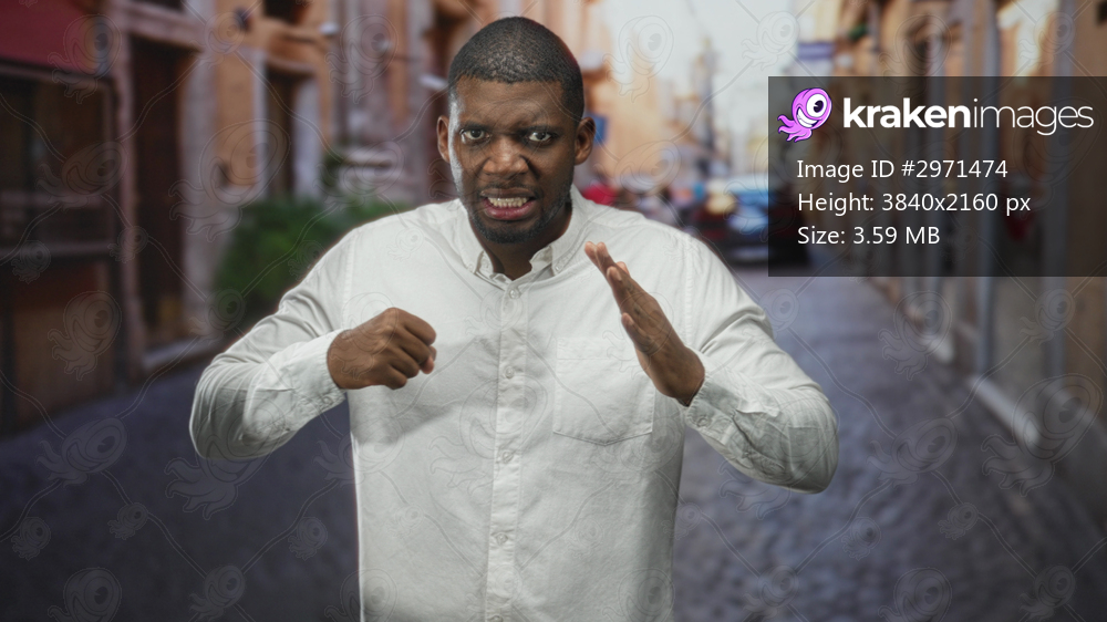 Man blocking with clenched fist and open hand on narrow street in white shirt, grimacing in a defensive pose; anger focus.